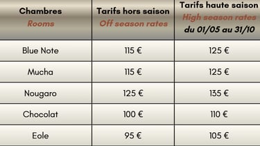 TARIFS (linge de maison inclus, taxe de séjour en supplément)